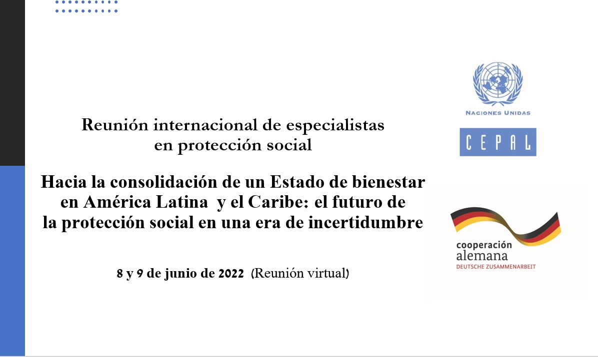 Esta reunión virtual tuvo por objetivo reflexionar desde una mirada experta sobre los principales desafíos para avanzar hacia sistemas de protección social universales, integrales, sostenibles y resilientes en el marco de un Estado de bienestar en la región que proteja los derechos y bienestar de las personas en un momento en que la matriz de riegos se está reconfigurando y está marcada por altos niveles de incertidumbre. Además, buscó propiciar un espacio de diálogo e intercambio entre la experiencia de América Latina y el Caribe y países europeos. El seminario fue organizada por la CEPAL y la GIZ en el marco de un proyecto financiado por el Ministerio Federal de Cooperación Económica y Desarrollo de Alemania (BMZ). Videos: