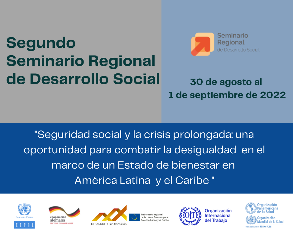 Autoridades, funcionarios internacionales y especialistas participaron en la jornada inaugural del Segundo Seminario Regional de Desarrollo Social organizado de forma virtual por la CEPAL en colaboración con diversas instituciones. Avanzar en protección social en América Latina y el Caribe es más urgente que nunca. Fue organizado por la CEPAL, en el marco del trabajo colaborativo con la Organización Internacional del Trabajo (OIT) y la Organización Panamericana de la Salud (OPS) y producto del trabajo conjunto con la Cooperación Alemana y la Facilidad para el Desarrollo en Transición de la Unión Europea.